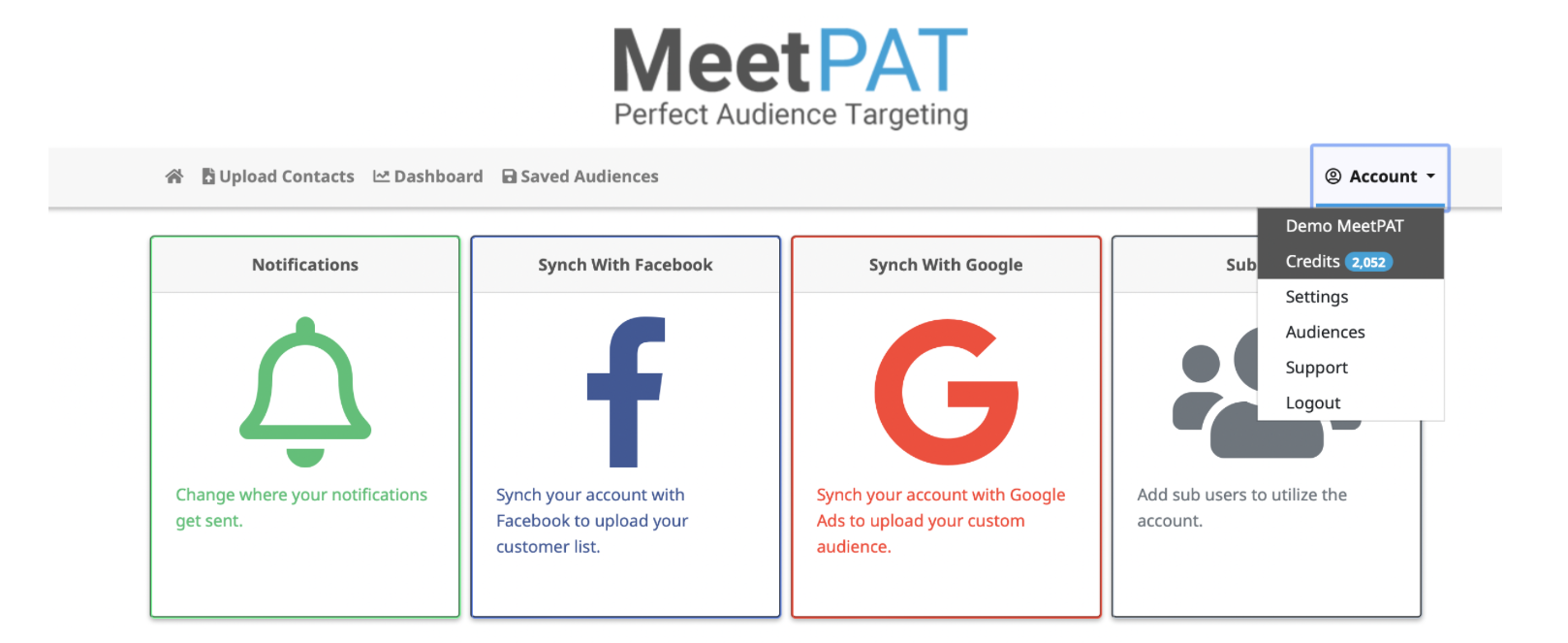 To see how many credits you have left please login to your MeetPAT account, and hover over Account in the top right hand side of the navigation.