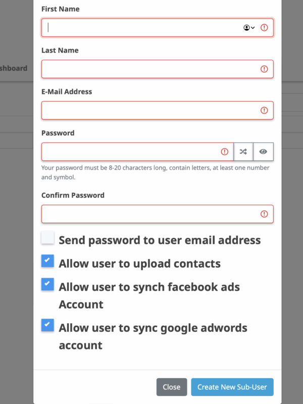 Fill in the users details and select their desired permissions. (we strongly advise only allowing marketing managers to be able to sync with Facebook and Google.